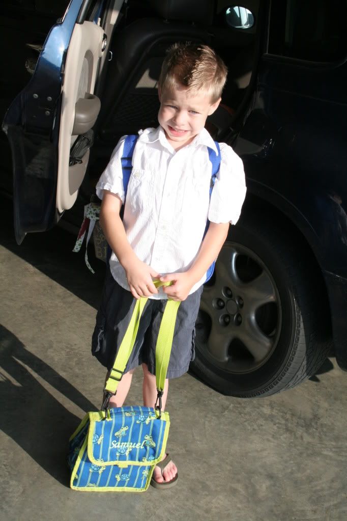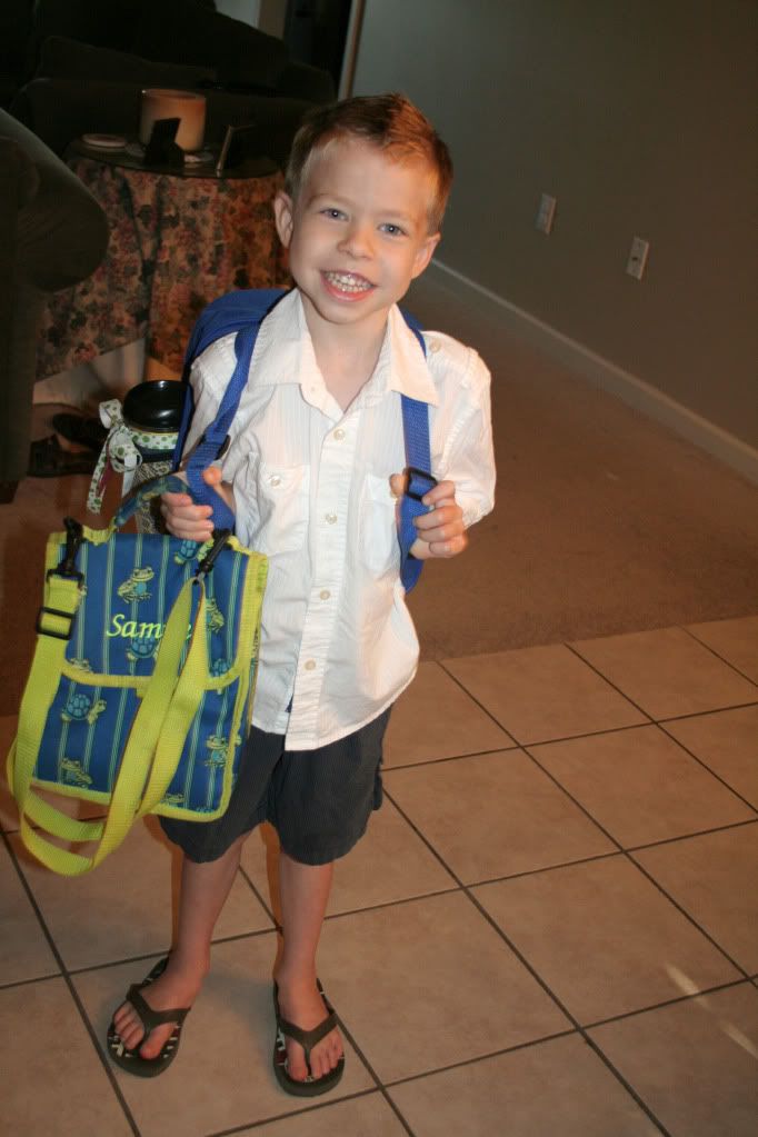 That's one big school for one little boy! When we got inside the school, a big group of teachers, aids and helpers were waiting on us at the top of the Kindergarten hallway. One of the ladies met Samuel, help him with his kindermat and headed down the hallway. He just went with her and seemed not to even care. He's so outgoing that I'm sure he made 5 friends by the time I left the school. The school had a BooHoo breakfast for the parents. We were able to meet other parents and make our kids a Kissing Hand that they will give to them later today.