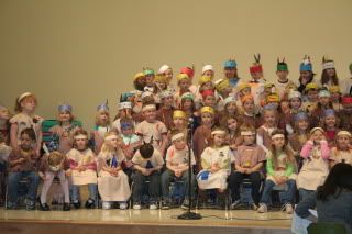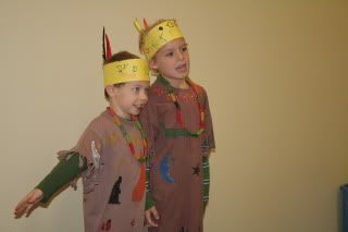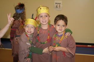 Their Native American outfits were adorable. In my day, we used paper bags to make ours, but they used oversized t-shirts for the boys and pillow cases for the girls. The teachers dyed them brown and cut fringe along the sleeves and bottom. Then the kids stamped and painted their shirts. They also made their headbands and necklaces.
