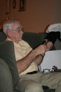 Delbert figuring out the gift we got him. It's a man's tool with like a dozen different gadgets including knives, pliers, wire cutters, etc.