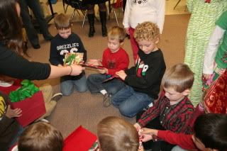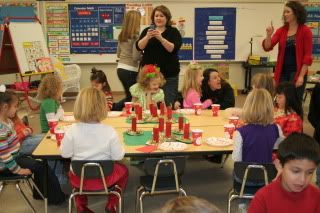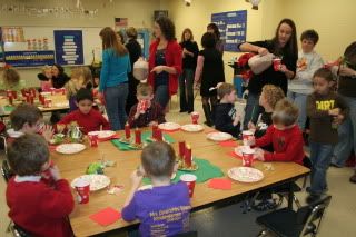 The Kindergartners parties were early in the morning, so our class did breakfast foods: donuts, french toast sticks, powdered donuts, pigs in a blanket, milk, juice, etc.