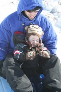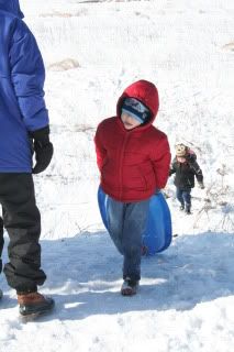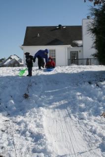 This is ARKANSAS people! We don't get a third snowday! Usually it's the day of, a little dirty snow maybe and then it's gone by day 3. Not only do we still have snow, we still have lots of it and plenty for sledding! We discovered the hill behind our house is pretty good for sledding. It was fun and the boys loved it!