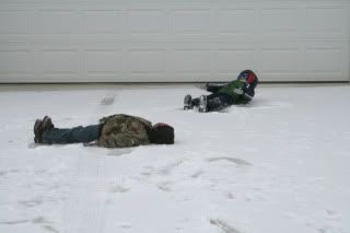 They made snow angels in the driveway because there wasn't enough snow on the grass to make them.