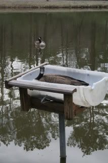 This is a goose that is setting in a nest dad built a couple years ago. We're curious how many eggs there are.